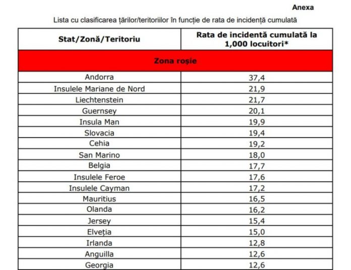 Față de lista anterioară, în zona roșie au intrat: Spania, Italia, Suedia, Dominica și Maldive;