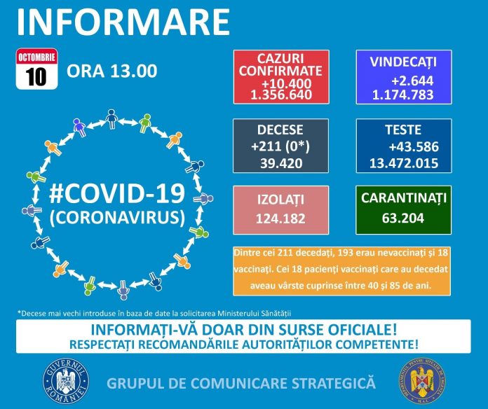 În intervalul 09.10.2021 (10:00) – 10.10.2021 (10:00) au fost raportate de către INSP 211 decese (99 bărbați și 112 femei), ale unor pacienți infectați cu noul coronavirus, internați în spitalele din Alba, Arad, Argeș, Bacău, Bihor, Bistrița-Năsăud, Botoșani, Brașov, Buzău, Caraș-Severin, Călărași, Cluj, Constanța, Dâmbovița, Dolj, Giurgiu, Gorj, Harghita, Iași, Ilfov, Maramureș, Mehedinți, Mureș, Neamț, Olt, Prahova, Satu Mare, Sălaj, Sibiu, Suceava, Timiș, Tulcea, Vaslui, Vâlcea și Municipiul București.
