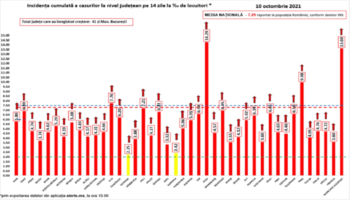 Coeficientul infectărilor cumulate la 14 zile, raportate la 1.000 de locuitori este calculat de către Direcțiile de Sănătate Publică, la nivelul Municipiului București și al județelor. Mai jos aveți graficul realizat în baza raportărilor primite de CNCCI de la Direcțiile de Sănătate Publică: