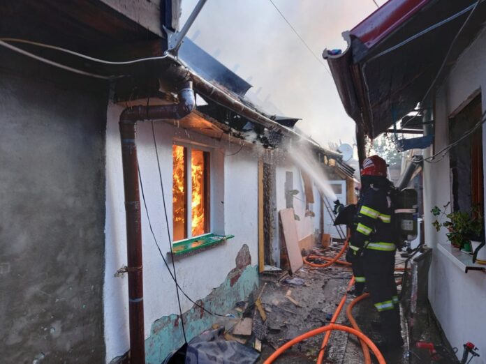 UPDATE ora 13.27: Incendiul este localizat și se intervine în continuare pentru lichidarea tuturor focarelor. Toate persoanele care se aflau în interiorul cladirii s-au autoevacuat. Au fost scoase 2 butelii din interiorul casei, de către pompieri.