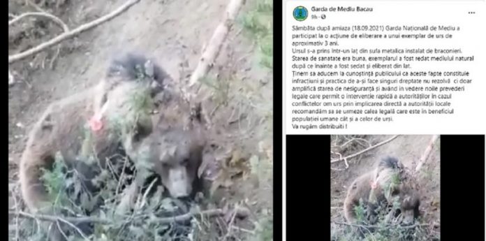 „Sâmbăta după amiaza (18.09.2021) Garda Națională de Mediu a participat la o acțiune de eliberare a unui exemplar de urs de aproximativ 3 ani. Ursul s-a prins într-un laț din sufa metalică instalat de braconieri.