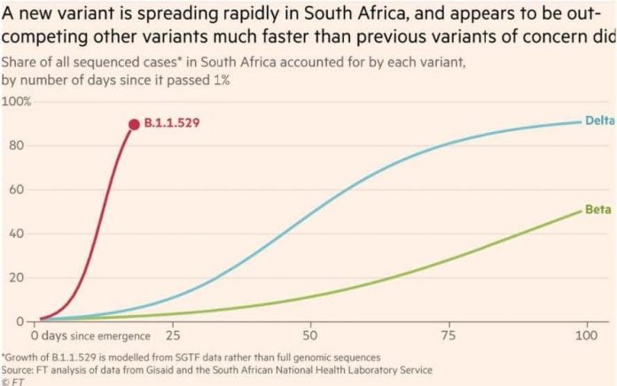 • Varianta omicron se raspândește cu rapiditate. Într-un grafic al răspândirii inițiale a variantelor virale, bate tot ce mișcă. Vedeți graficul.