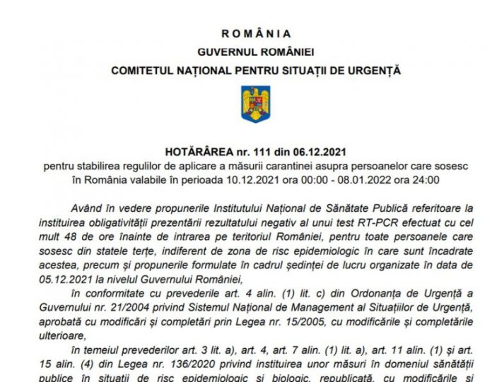Comitetul Național pentru Situații de Urgență a adoptat Hotărârea numărul 111 pentru stabilirea regulilor de aplicare a măsurii carantinei asupra persoanelor care sosesc în România valabile în perioada 10.12.2021 ora 00:00 – 08.01.2022 ora 24:00.