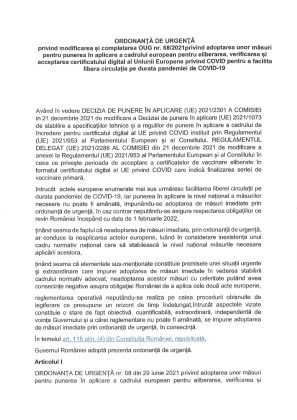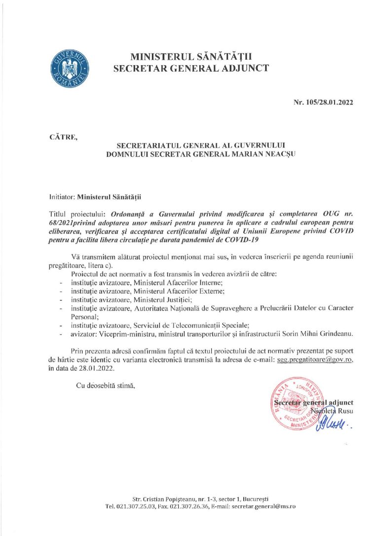 Guvernul a pus în dezbatere publică un proiect de ordonanță prin care valabilitatea certificatelor covid expiră la 270 de zile de la efectuarea schemei complete de vaccinare.