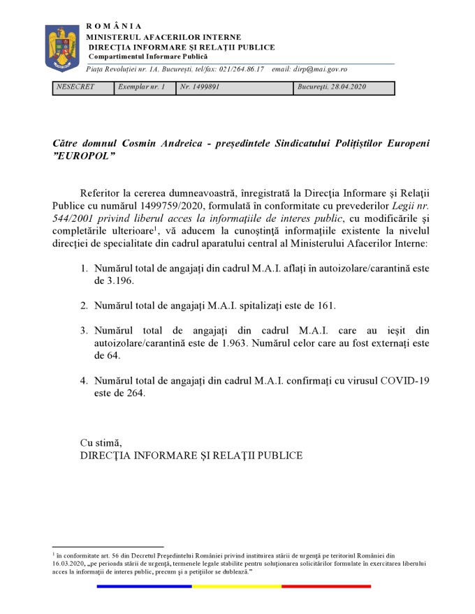 ”Încă de la începutul pandemiei, Ministerul Afacerilor Interne a ținut ascuns numărul de angajați care sunt infectați cu noul coronavirus, deși majoritatea dintre polițiști au fost în linia întâi, iar riscul de infectare era iminent”, susține sindicatul Europol.