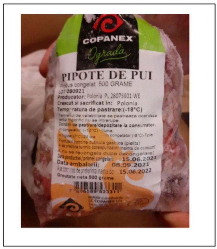 Vă informăm că societatea COPANEX S.R.L. a inițiat retragerea de la comercializare a produsului ” PIPOTE PUI 500G „, ca urmare a evidențierii prezenței Salmonella Enteritidis în produs.